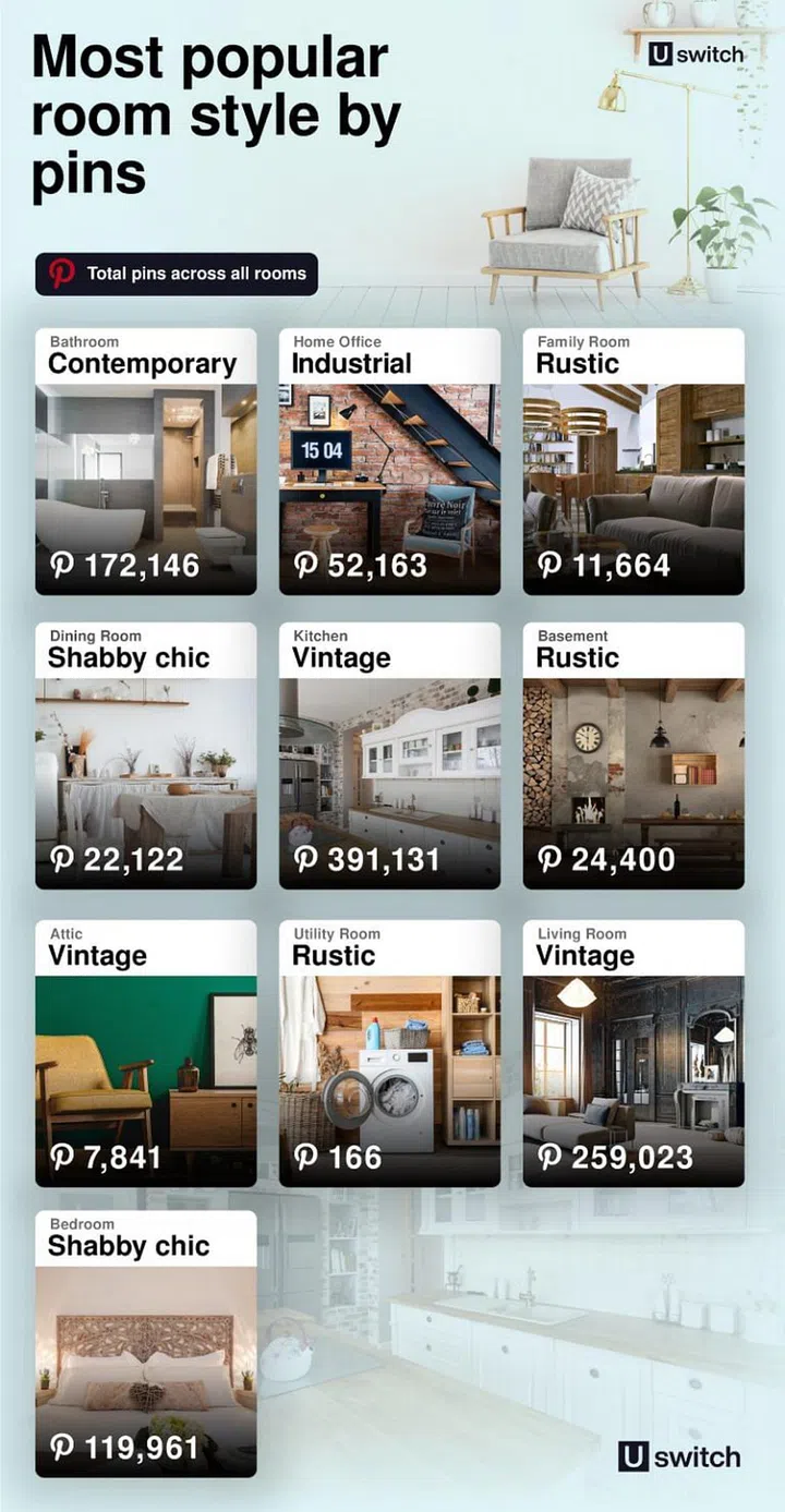 This room’s second most popular interior theme is vintage, gaining 42,668 pins followed by minimalist, which has 38,866 total pins.