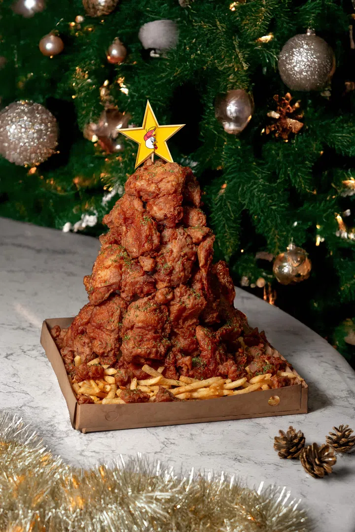 This Christmas tree is adorned not with baubles and fairy lights, but with crisp chunks of fried chicken.