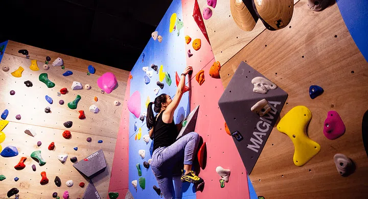 Bouldering means climbing without any rope or harness; there’ll be a landing mat for safety. It’s by far the most accessible: all you need are climbing shoes and chalk.
