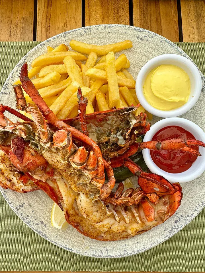 Grilled lobster with bits of coconut, and truffle fries, one of the many delicious mains on the menu at Coco Beach Club. Photo: Chelsia Tan
