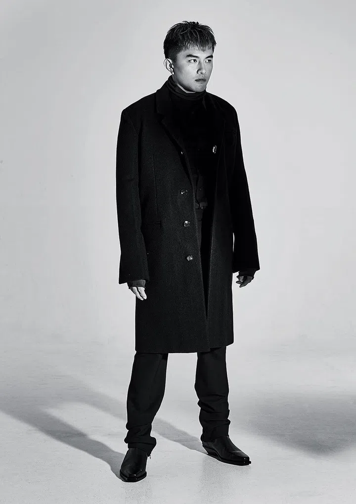 What he's wearing: Viscose sweater, poplin shirt, wool trousers, wool long coat, and leather boots. Bottega Veneta.