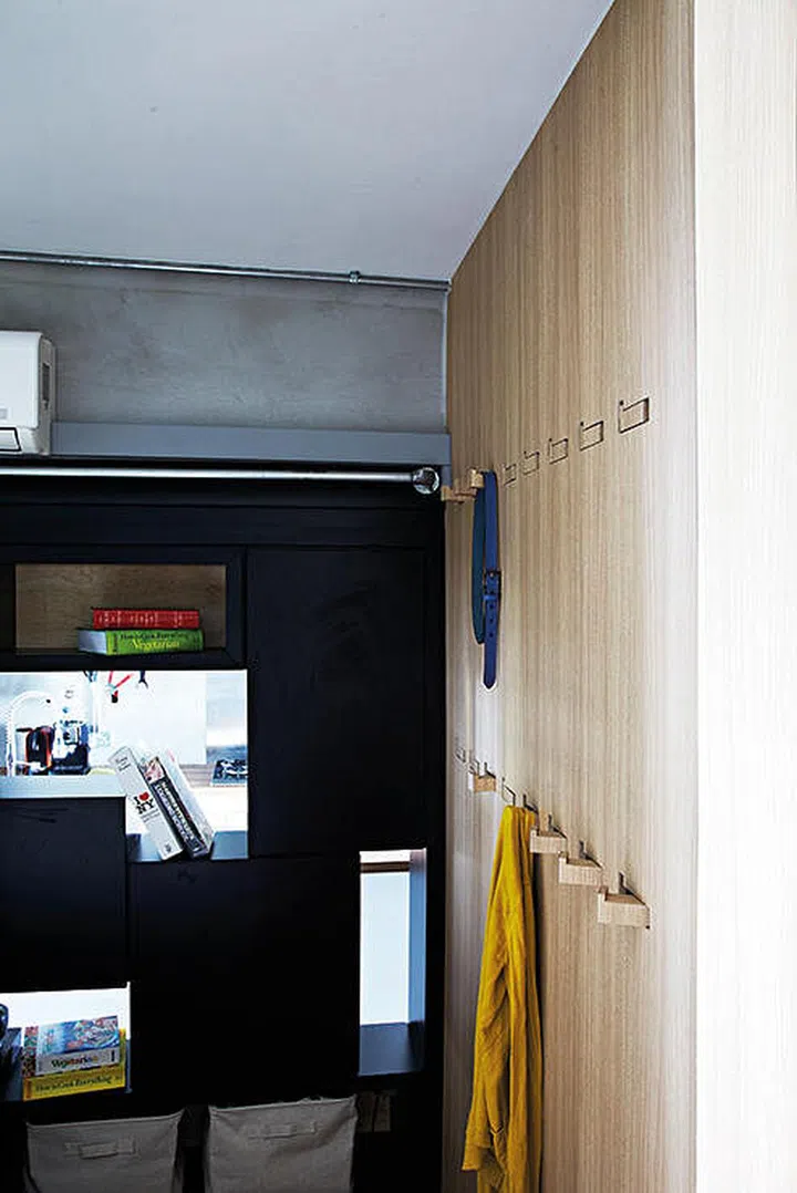 It is crucial for a small bedroom to remain free of clutter in order for it to appear restful. And that includes visual clutter. Opt for clever designs that keep surfaces clean cut, such as these hooks which can be flushed neatly into the wall when not in use. What a simple yet ingenious mechanism!
