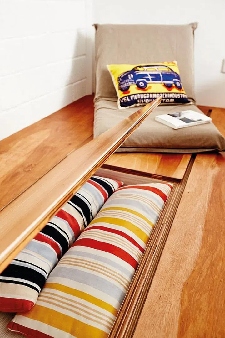 A platform bed is a brilliant solution for incorporating storage into your sleeping area. And we suggest you imbue more fun and cosiness into it by creating a couple of steps made out of open and closed storage compartments that leads to the bed.