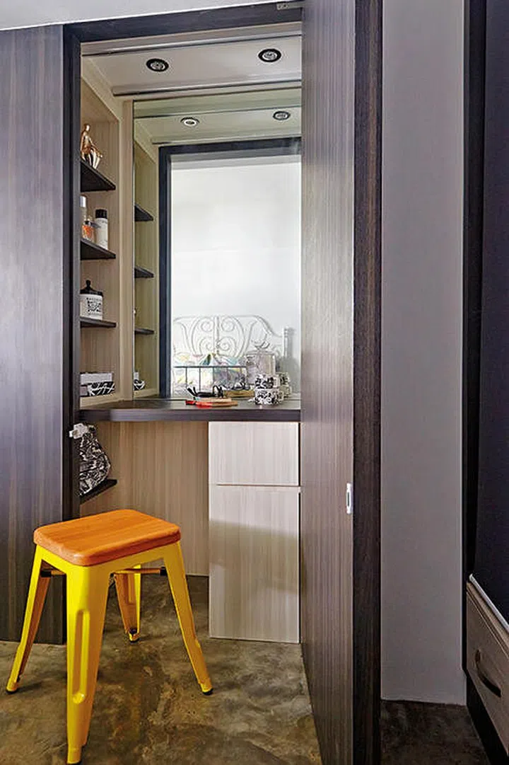 Another interior design trick professionals use to keep small rooms visually clean cut is by using hide-and-seek elements to conceal certain features. In this case, a door panel was used to camouflage a vanity counter.