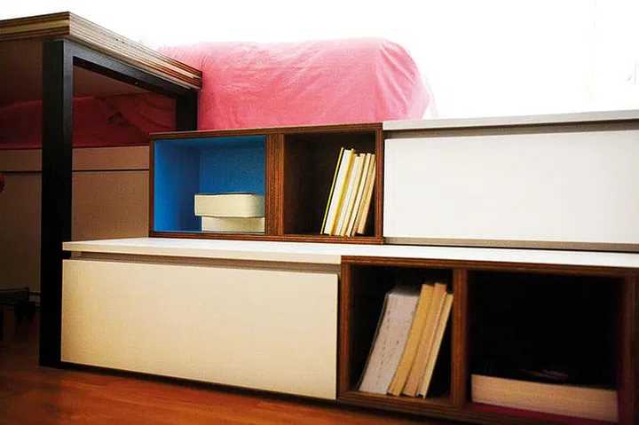 A stylish alternative to built-in shelves is the incredibly versatile string shelving system, which has detachable components such as folding tables, work desks, and cabinets which you can use to customise your own compact storage and work space.