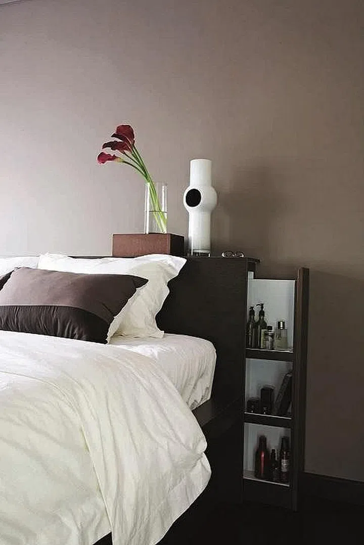 Don’t underestimate the effectiveness of small storage nooks such as this pull out shelf concealed in a headboard! It may not be much, but it’s just the right size for holding bottles of lotions and fragrances, and removes the need for a bedside table.