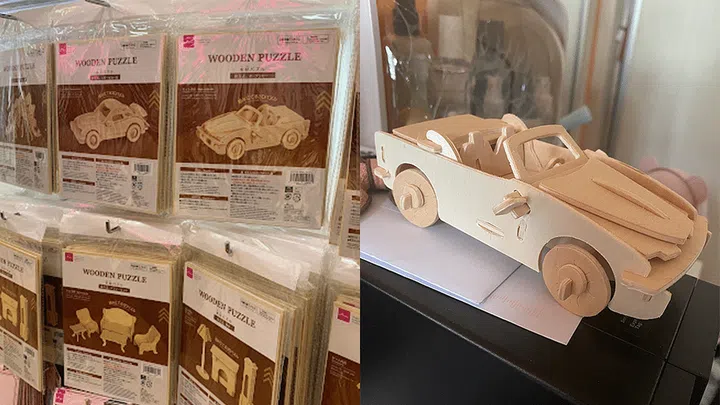 Put your spatial awareness and fine motor skills to the test by making your own little dollhouse, or car or even a dinosaur with these wooden puzzles from Daiso. This activity could be on the harder side, so definitely help the kids along the way.