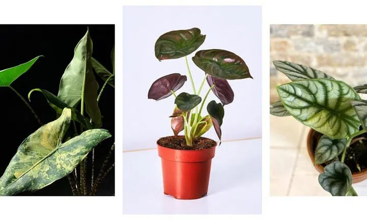 Alocasia black velvet (middle) has dark velvety foliage, with contrasting silver veins.