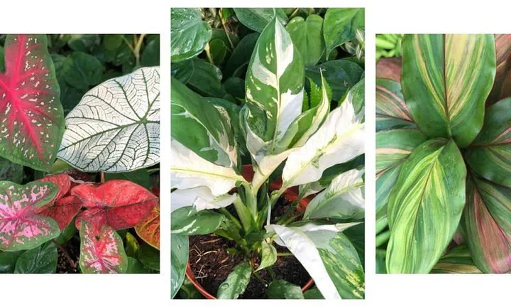 “Caladium (left) is also commonly known as ‘elephant ears’, ‘heart of Jesus’ and ‘angel wings’. Its colourful leaves stand out among the greens.