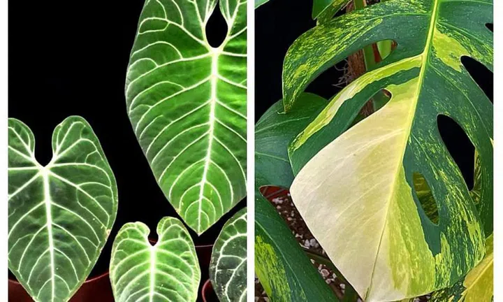 Variegated Monstera or Monstera Thai Constellation (right) – a monstera deliciosa with attractive variegated leaves.”