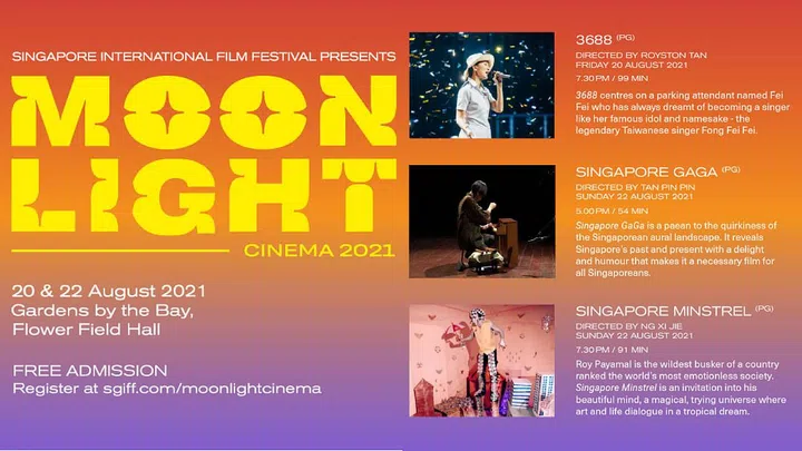 Nothing beats a romantic outdoor cinematic experience. This weekend, Singapore International Film Festival (SGIFF) will host its fourth edition of Moonlight Cinema in partnership with Gardens by the Bay, on 20 and 22 August. Over these two days, audiences can enjoy free film screenings that spotlight the whimsical and magical side of Singapore. As part of its initiative to foster deeper film appreciation in Singapore, you can expect a slate of notable Singapore films by directors Royston Tan, Tan Pin Pin and Ng Xi Jie. These films include a musical drama 3688 by acclaimed director Royston Tan, Singapore GaGa by award-winning filmmaker Tan Pin Pin and Singapore Minstrel by Ng Xi Jie.