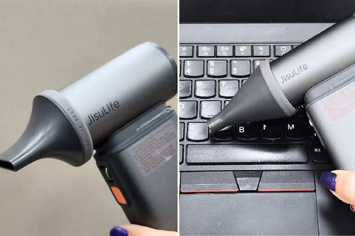 The hairdryer-shaped nozzle (left) can dry up water or *sweat* stains on your clothes, and the tapered round nozzle (right) can be used for cleaning out your keyboard.