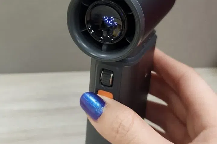 The speed setting can be easily ramped up from 1 to 100 with a scroll wheel, with the latter delivering a rather impressive jet of air. At its fastest, it clocks a maximum wind speed of 19m/s, which the website says is akin to that of a force 8-strong gale. The wind strength is displayed on a small digital screen, which also allows you to monitor the battery life when switched on.
