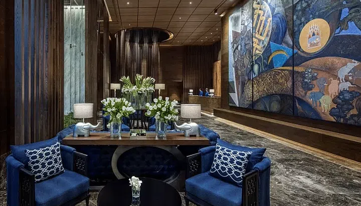 As you step inside, you are greeted by a warm, cavernous interior that exudes refined luxury. The soaring ceilings and walls adorned with mahogany wood panels are a further show of extravagance. A massive piece of wall art, Auspicious Path by Panya Vijinthanasarn, further adds to the atmosphere of regality and splendour.