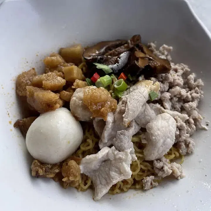 What tops her noodles are freshly cooked lean pork, as well as fishball and pork ball. But there is no liver.