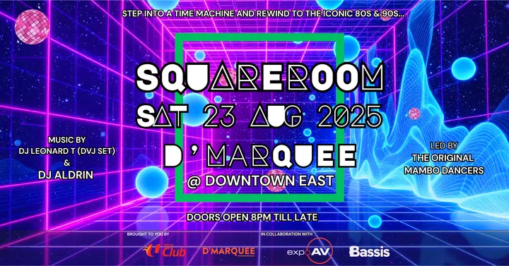 Throw it back to the 80s and 90s at Squareroom — a one-night-only retro dance party happening at the newly revamped D’Marquee, Downtown East!