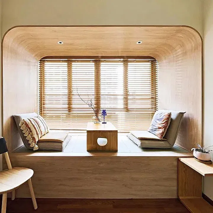 The guest bedroom pays homage to the Japandi style that Haikal originally wanted. A tatami platform was built over an existing bay window. The Zen setting with a view of the swimming pool is perfect as the room is also where Haikal reads or takes work calls.