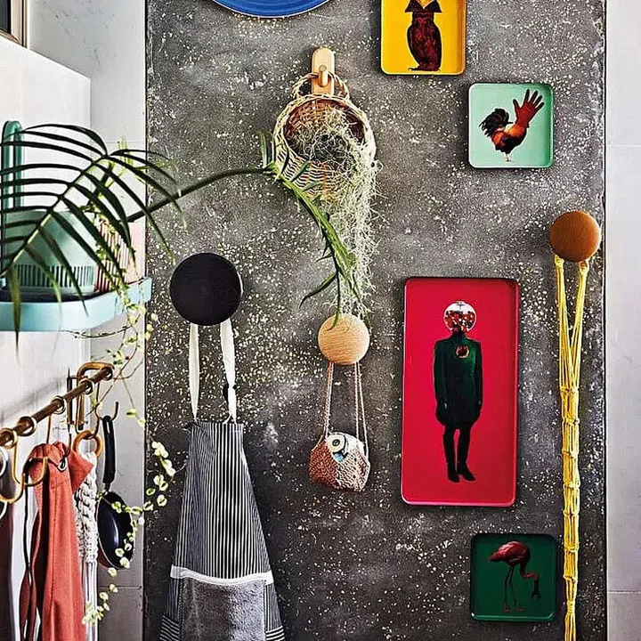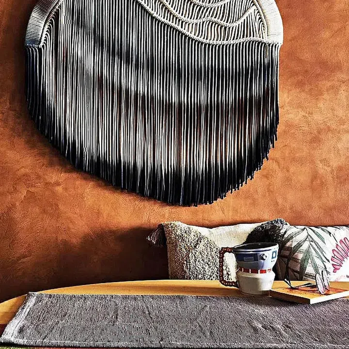A handwoven wall hanging with rustic ombre effect adds a perfect finishing touch to the final look of the space.