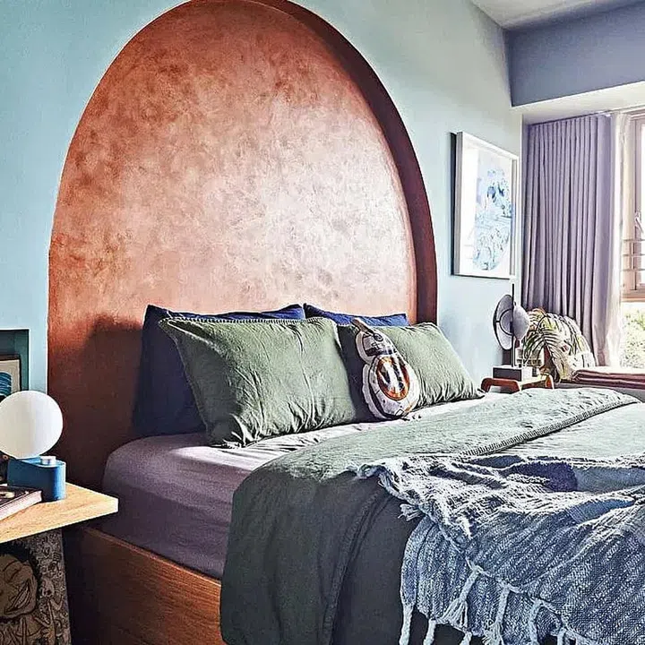 The layouts of the rest of the bedrooms and bathrooms also saw some extensive changes involving the shifting of walls and relocating of doors. The existing corridor was dispensed with and replaced with a cosy nook behind a curtained arched opening that leads to the two bedrooms and common bathroom, each accessible via an arched doorway.