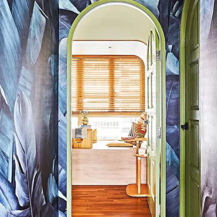 Bold botanical wallpaper accents the line green arched door frame leading into the guest room.