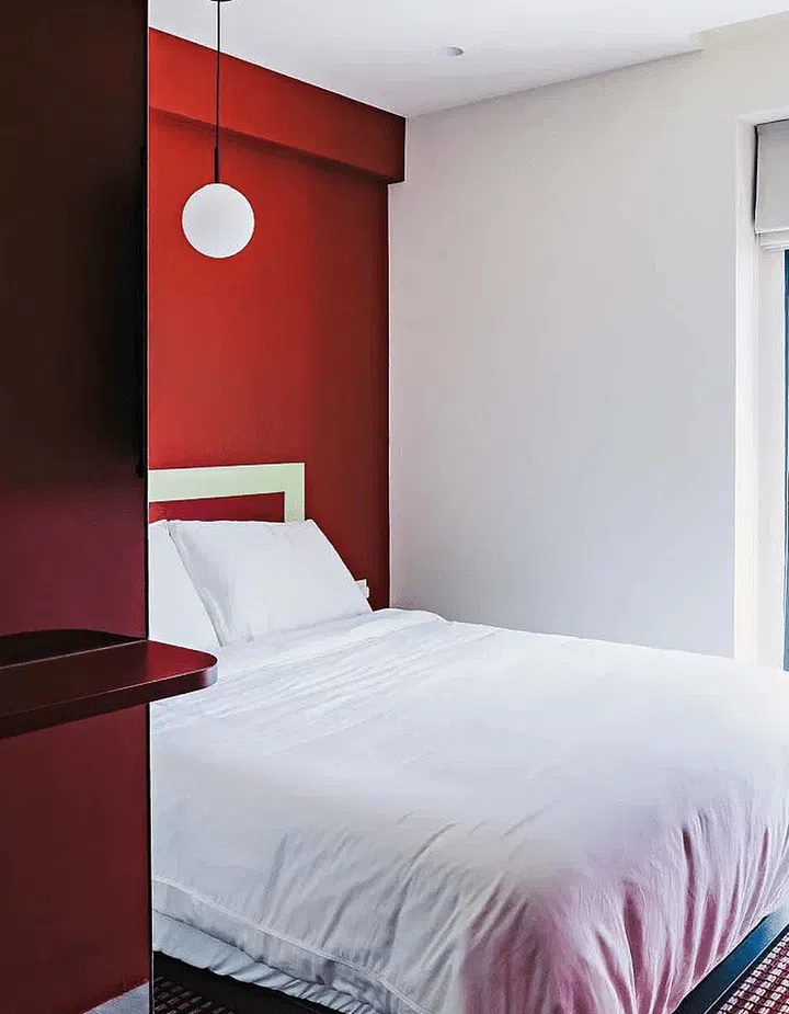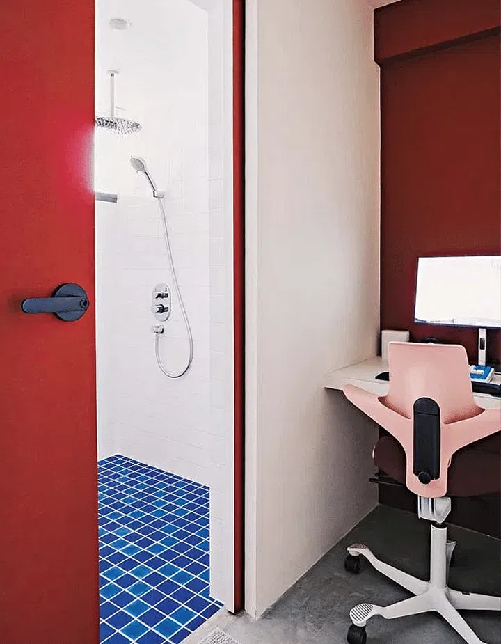 Like the shared spaces, the bathrooms and bedroom were splashed in colour. The powder room is awash in a sunny yellow. Red is the main colour for the master bedroom.