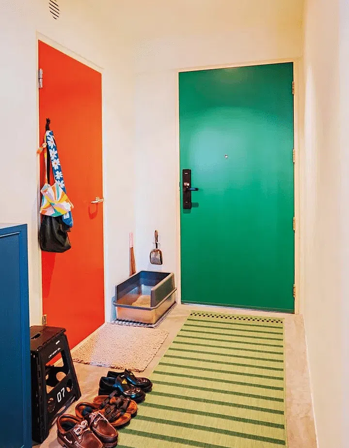 The foyer, with the viridian green main door and orange household shelter door, gives a taste of what is to come.