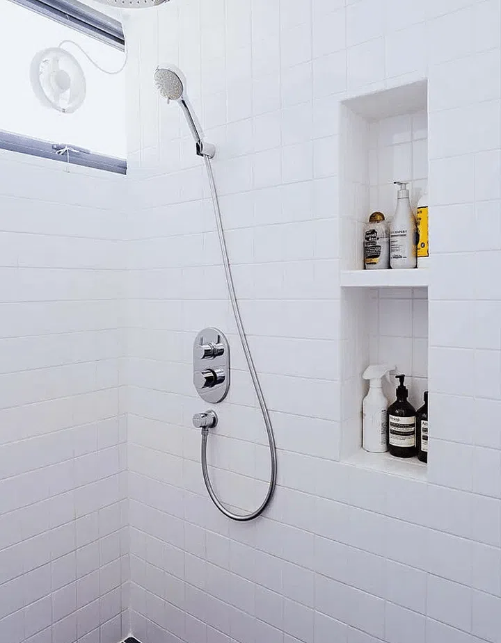 The couple wanted to recreate a pool for the master bathroom. They chose white tiles for the walls to avoid overwhelming the space.
