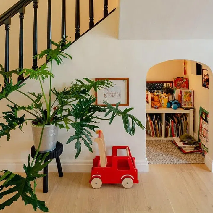 As you enter the house and before you reach the living room, it’s hard not to notice the cute storage area underneath the stairs. Their child’s toys, books, and other clutter are neatly tucked here – for quick access and cleanup.