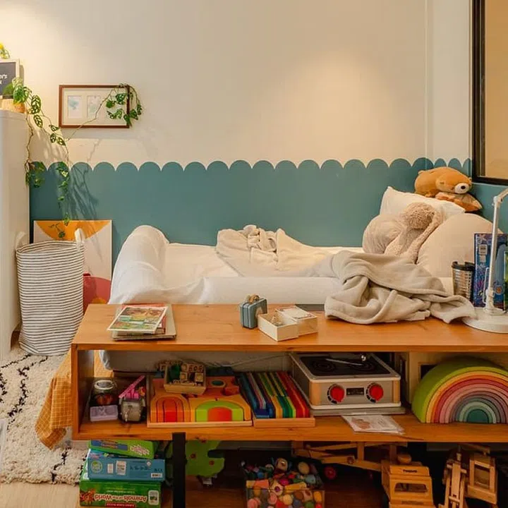 Their son’s playroom, with two-tone wall paint and filled with toys and books, is undoubtedly the liveliest room in their house. Before, this room used to be the darkest space in the whole place. So to address the issue, they installed ample lighting inside and also created a fixed interior window.