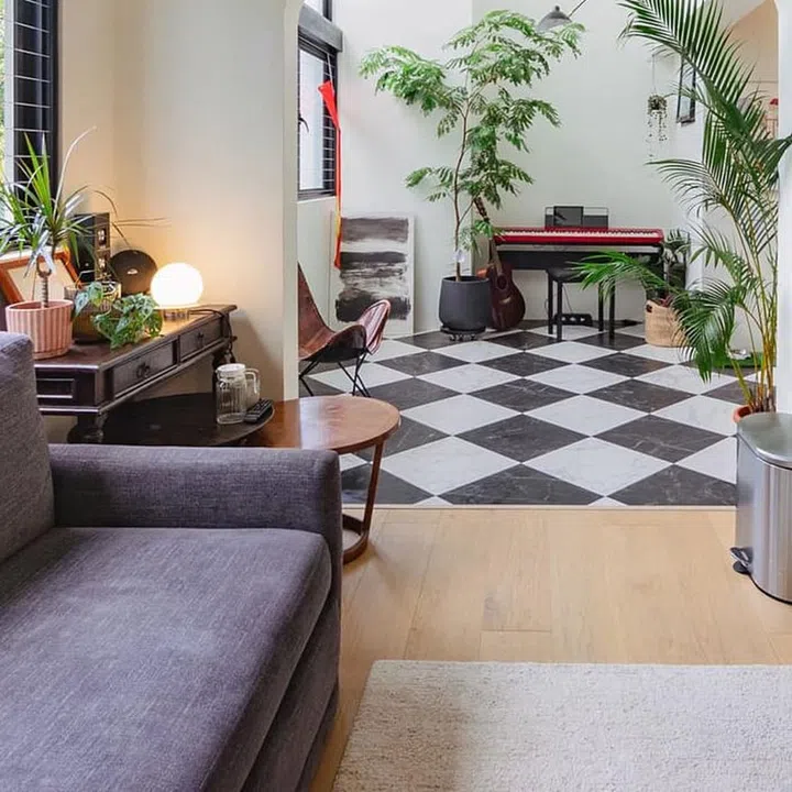The black and white checkered floor in the sunroom adds a certain degree of sophistication and elegance to the room.