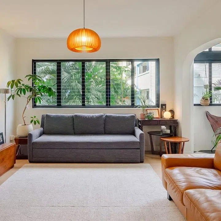 As such, the couple decided to leave the windows with no curtains. The green decor outside the window spills easily inside because of the multitude of indoor plants in the living room.