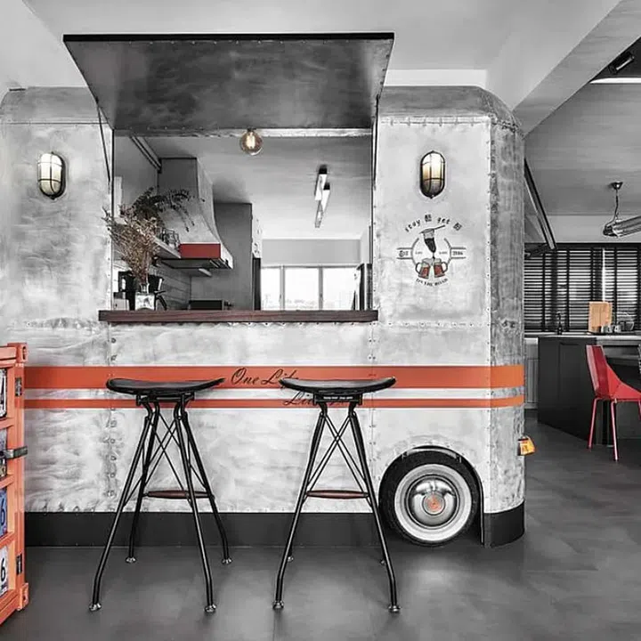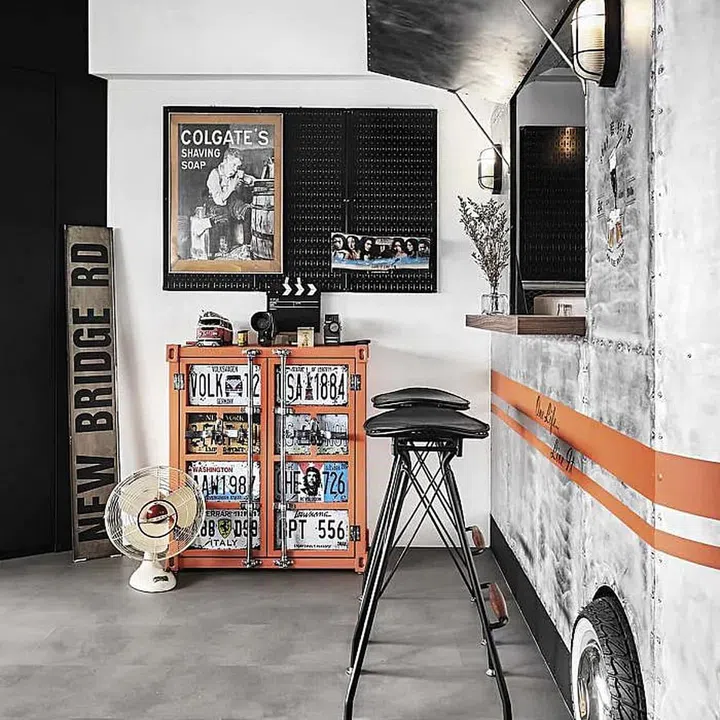 “It begins with Foong Hwee’s love for caravan,” shares Kelvin of the starting point of the design. “Then we decided to create a garage inspired interior.”