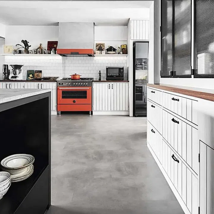 Throughout this monochromatic home, pops of bright orange from furniture, appliances and cinema posters lend freshness to the colour palette.