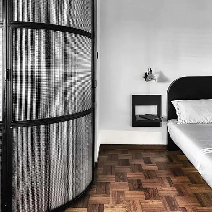 Inside is a tranquil haven for rest. Kelvin kept the original flat’s parquet flooring and installed a custom bed with a curved headboard and cantilevered base that allows a robot vacuum cleaner under it.