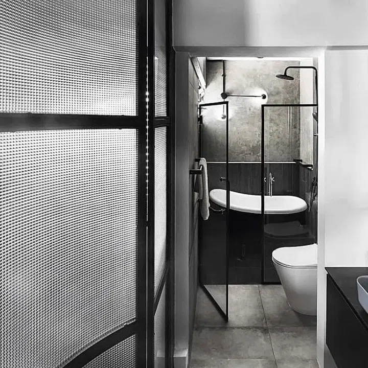 Paired with a curving steel frame, it evokes a chic retro vibe. Behind it is a spacious bathroom, which has been enlarged to accommodate a bathtub.