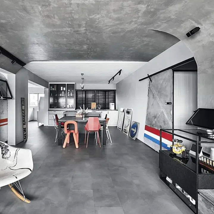 The adjoining living room is spacious; its surfaces are predominantly finished in grey. Kelvin did not hack the original flooring, opting for a less disruptive method of refreshing the flooring by layering it with concrete-look vinyl.