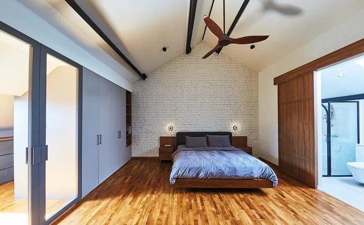 Perched above the rest of the shophouse apartment is a loft that houses the master bedroom. The exposed brick wall, pitched roof and exposed roof rafters convey an almost chapel-like quality with a tranquillity befitting a room for rest and relaxation.