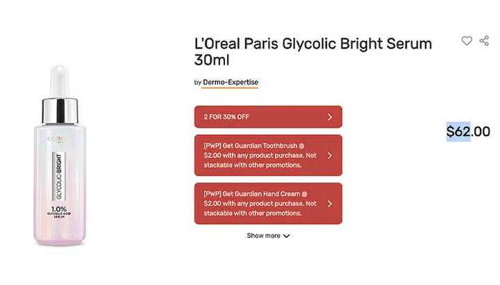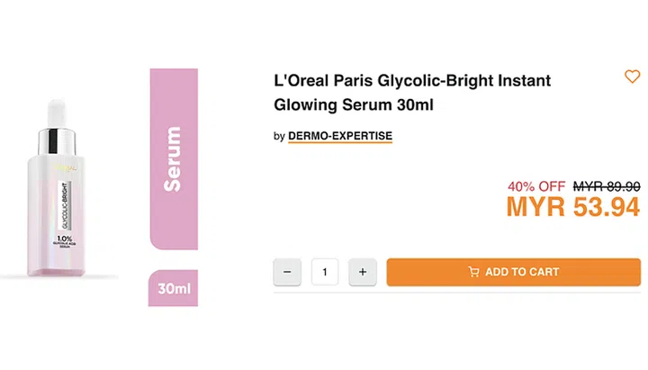 For those who prefer to stick to bigger brand names, you’ll be glad to know that the L’Oreal Paris Glycolic Bright Serum (30ml) is also significantly cheaper in JB.