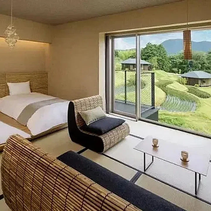Opened in August 2019, expect 45 guest rooms – four of which exist as standalone villas, featuring locally-sourced tatami floors and timber – scattered around picturesque rice terraces (with architecture and designs courtesy of Kengo Kuma), all set against the majestic volcano that is Mount Yufu.