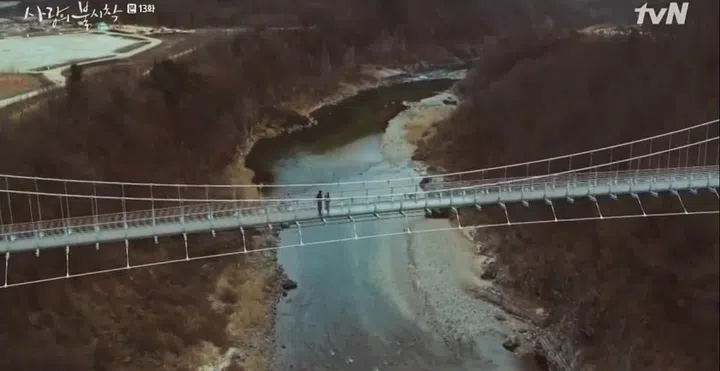 On one of their random strolls in South Korea, Ri Jeong Hyeok recalls a memory in Switzerland where he asks a seemingly troubled woman to take his and Seo Dan’s photo. Little did he know that he saved Yoon's life. This sweet conversion takes place at the Hantan River Sky Bridge just in Pochen, South Korea overlooking gorgeous landscapes as well.