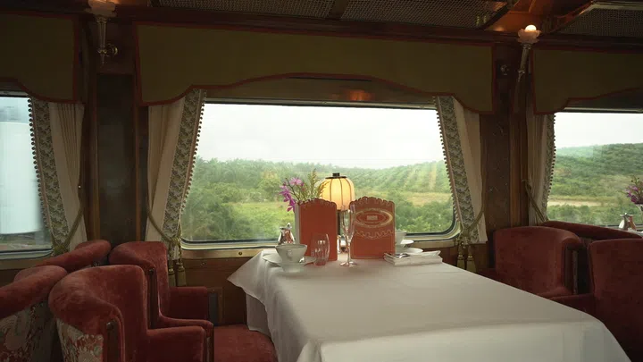 The elegant Malaya Dining Car aboard the Eastern & Oriental Express offers a truly exquisite culinary journey through Southeast Asian flavours.