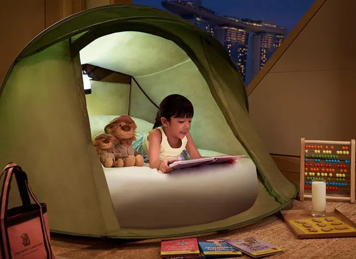 Enjoy a little joie de vivre with the whole family at the Sofitel Singapore City Centre, known for its French flair and attitude. Kids will be set up with their own special themed tents complete with a mattress for sleeping, as well as special amenities. Everyone can enjoy a luxurious breakfast in Racines, plus a swim in the hotel’s 30-metre long infinity pool, not to mention a late check-out at 4pm. Families can also enjoy SGD$40 F&B credits per night to be used at Racines, COFFEA and 1864. Room rates start at $335++ for a Luxury Room that fits up to two tents.