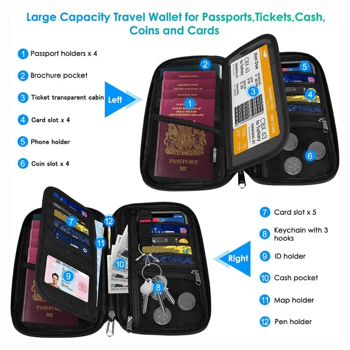 Constructed with lightweight and waterproof nylon, the P Travel Design passport holder fits up to four passports and nine credit cards, with extra slots for other cards, coins, pens and keys. The RFID blocking technology also prevents any information theft.