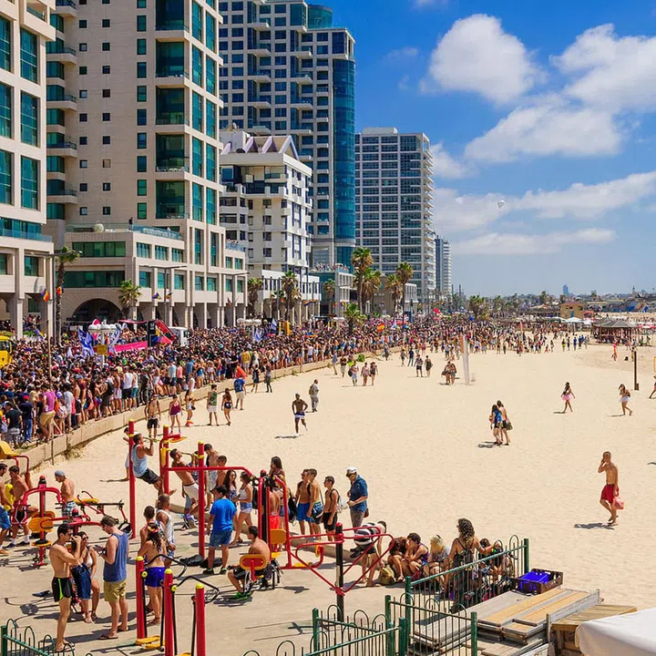Tel Aviv sits on the Mediterranean coastline and boasts a dozen beaches, where Israelis love to relax.