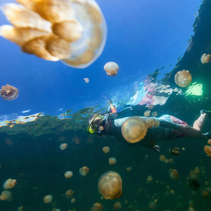 Swim in a lake with jellyfish that have one amazing quirk: no sting.