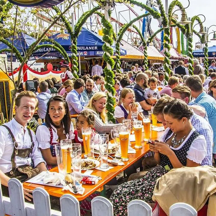 Visitors celebrating Oktoberfest in the beer garden, wearing traditional costumes.