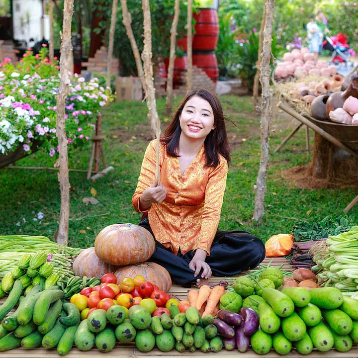 A salesgirl with her bamboo basket full of vegetables in the culinary fair at the Van Thanh tourist area, Ho Chi Minh City.