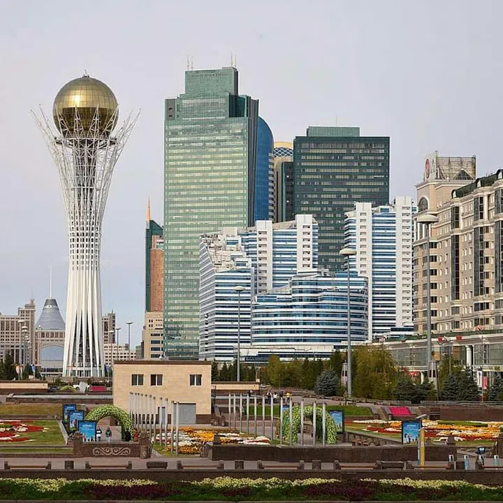 Baiterek, a monument and observation tower, in Astana resembles a tree with a golden egg nestled at the top. On its right is the Emerald Towers complex, which pays homage to the indigenous prairie grass.