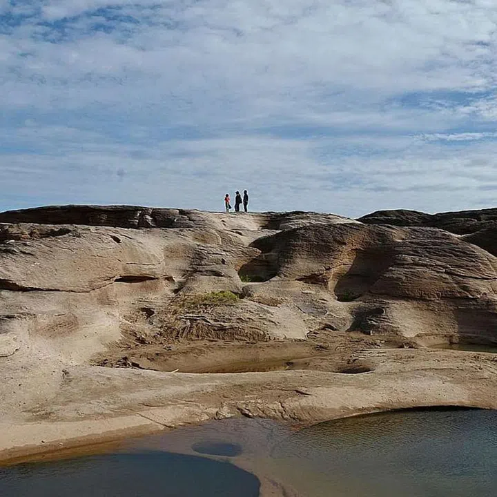 A family stands atop a rock at Sam Phan Bok in Ubon Ratchathani.