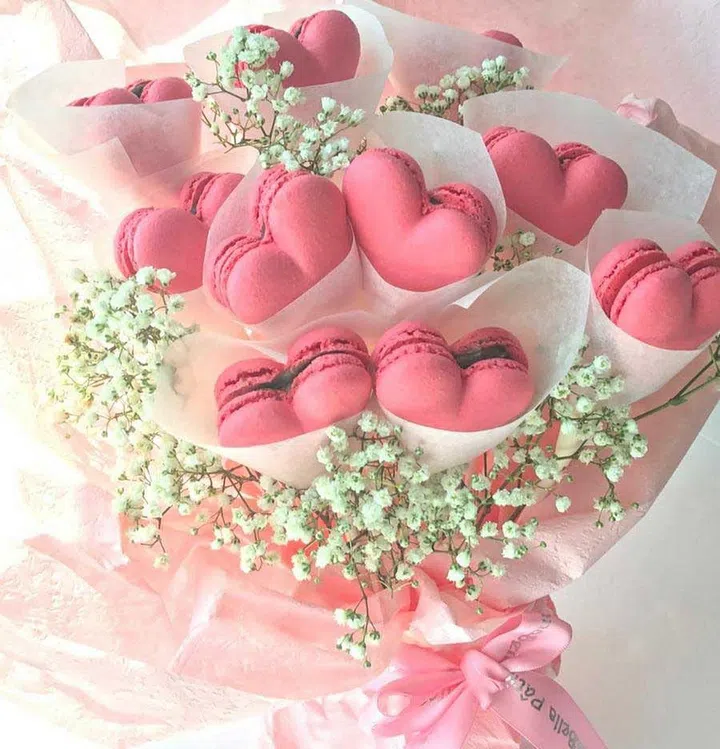 The beautiful arrangement features ten heart-shaped macarons with chocolate filling, bundled together with stalks of baby's breath.